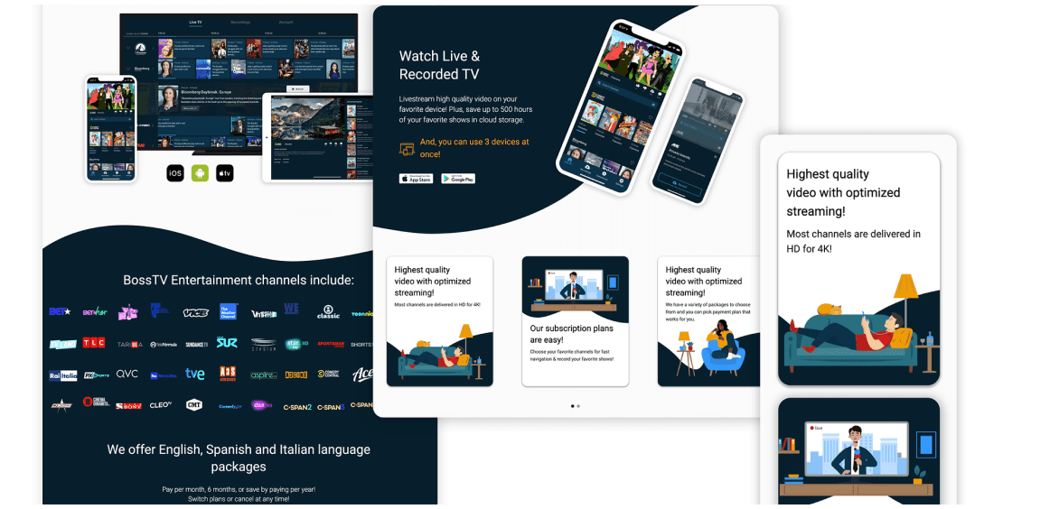 Boss TV is a platform where users can watch more than 11,000 live streams from around the world with subscription packages in multiple languages. The platform provides an interactive viewing experience that allows users to easily buy onscreen products without leaving the app, making it a great option for watching live TV on the go.
